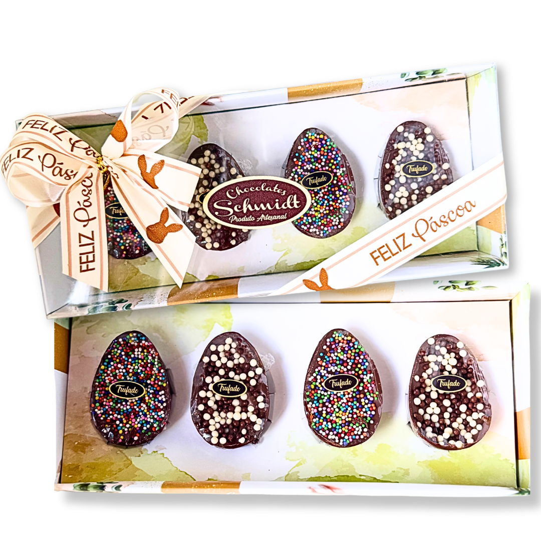 Deliciosos ovos de chocolate ao leite, recheados com ganache belga, e cobertos com confeitos variados.Sem dúvida, uma experiência única de cremosidade e uma deliciosa explosão de sabores.
