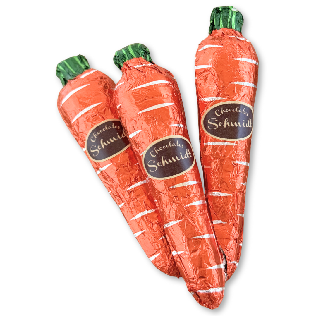 Cenourinha de chocolate ao leite, maciça, 27 g cada, embalada em papel alumínio estampa cenoura.