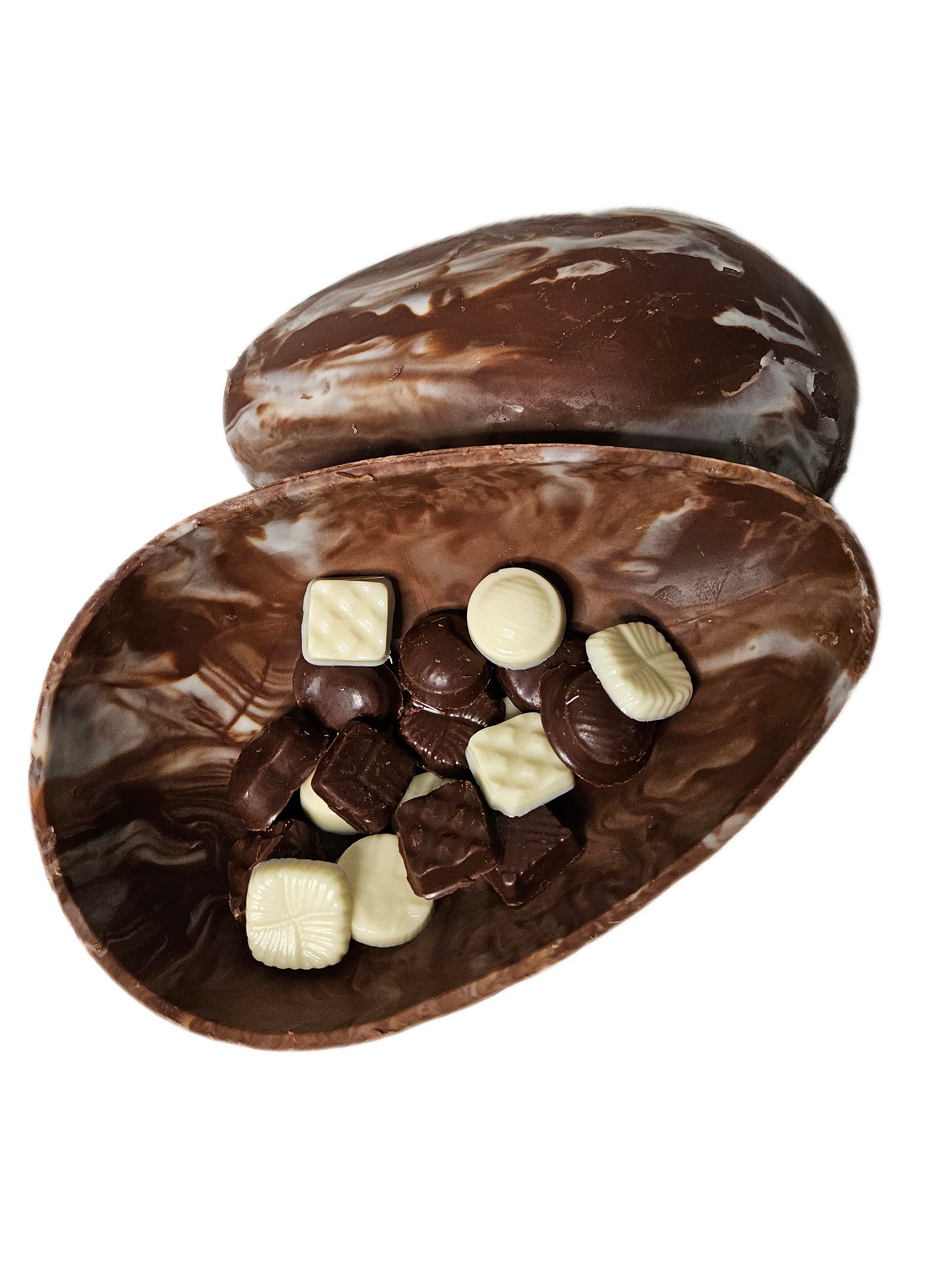 Ovo confeccionado artesanalmente, pintados um a um, mesclado com chocolate ao leite e chocolate branco .