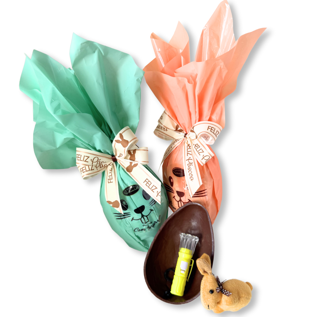 Ovo com casca de chocolate ao leite contedo um chaveiro de coelhinho de pelúcia surpresa em cores variadas, ou lanterna de led com cores variadas.